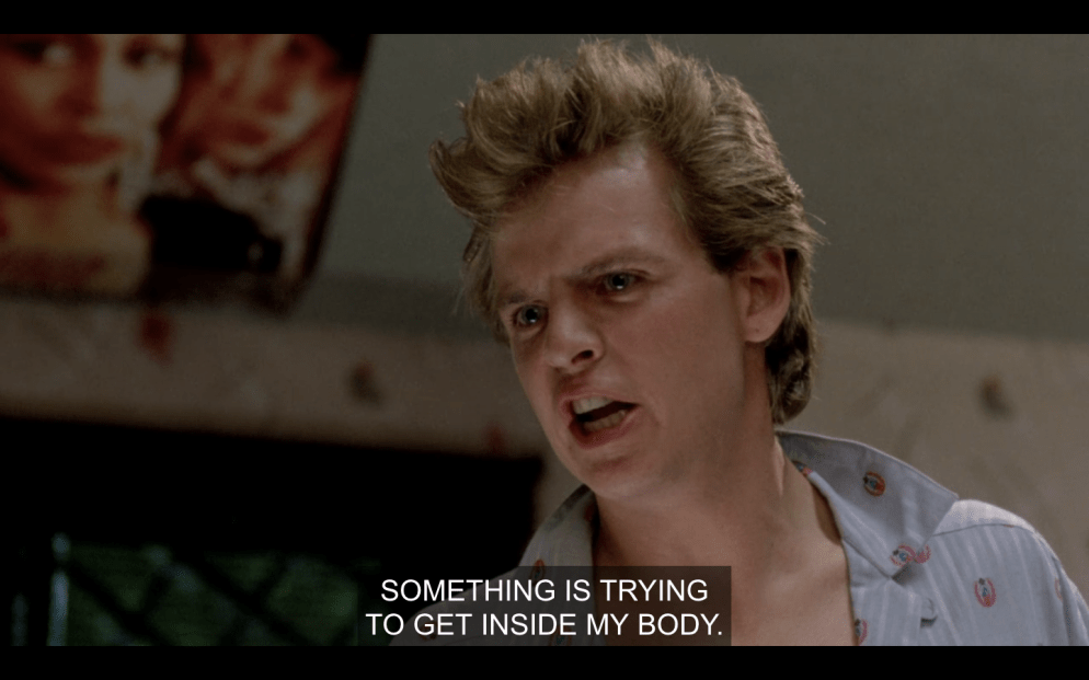 Yup, this film is very gay. Further gay material includes Jesse wrestling with his jock friend Grady after having his tracksuit bottoms pulled down; numerous scenes in the guys’ locker room; lots of shots of Jesse in his underwear – unlike most horror of the time there is much less objectification of the young female body and no shots of exposed breasts, instead a young male actor is objectified (I’m not saying this was progress but I am noting the difference, and teenage me would’ve appreciated it); a scene at a queer S&M club (yup); a shower scene in which the nasty sports coach – who turned up at the S&M club in a leather vest – is tied to a shower with skipping ropes, stripped, whipped on the bum and then clawed to death (yes, actually). Central to the story is the will-they-won’t-they between Jesse and Lisa, an absolutely stellar horror heroine. At the infamous pool party, the pair are finally making out when Freddy’s gruesome tongue appears from Jesse’s mouth. Lisa doesn’t see but Jesse flees to Grady’s house where Grady is tucked up in bed not wearing many clothes. Jesse is terrified…